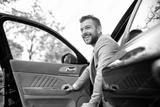 Smiling man exiting his vehicle