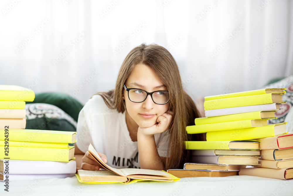 Beautiful teen girl reading a book in the room. Concept of education, hobby, study and world book day.