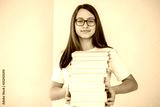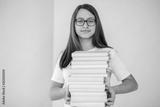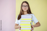 A smart teen girl holds many different textbooks. Back to school. Concept of education, hobby, study and world book day.