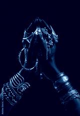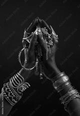 Blue woman's hand with indian Silver jewelry. Oriental Bracelets on a hand. Silver Jewelry and luxury accessories