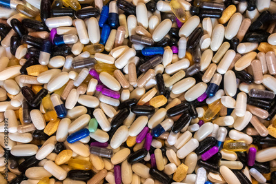Top view of lot of pills and capsules . Medicines, Healty lifestyle, fitness concept