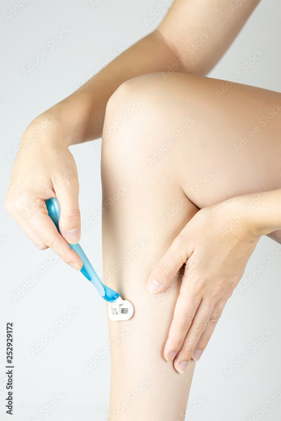 Woman shaving her legs with razor. Space for text. Concept Skin Care and Health. Hair Removal.