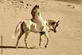 Rider in traditional clothes rides an arabian horse in the desert. Horizontal, side view, in motion.