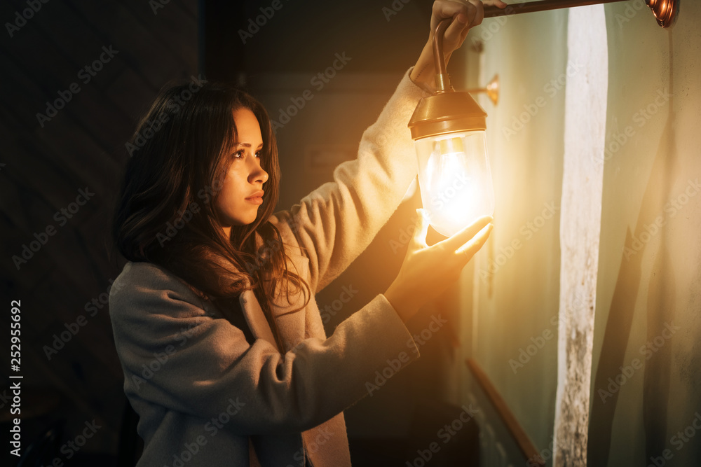 Young beautiful woman holds in her hand a small wall lamp