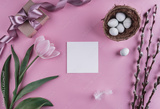 Easter eggs in nest and tulips flowers on spring background. Top view with copy space. Happy Easter card.