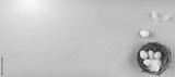 Easter eggs in nest on blue background. Top view with copy space. Happy Easter card