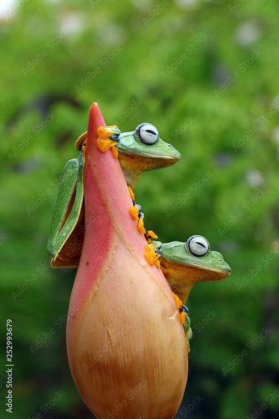 Two tree frogs on flower buds