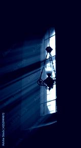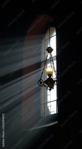 Piękne promienie światła wpadają przez duże wysokie okno kościoła, tworząc niezwykłą poświatę, piękna kuta lmpa zwisa z sufitu