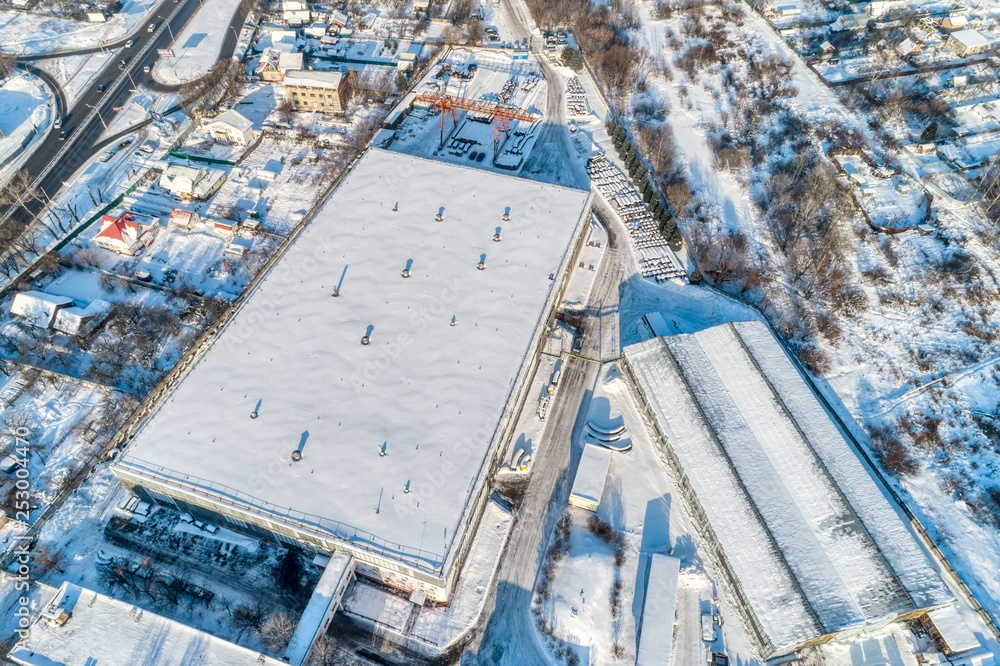 Large warehouse hangar, industrial zone of the city. Sunny winter day.