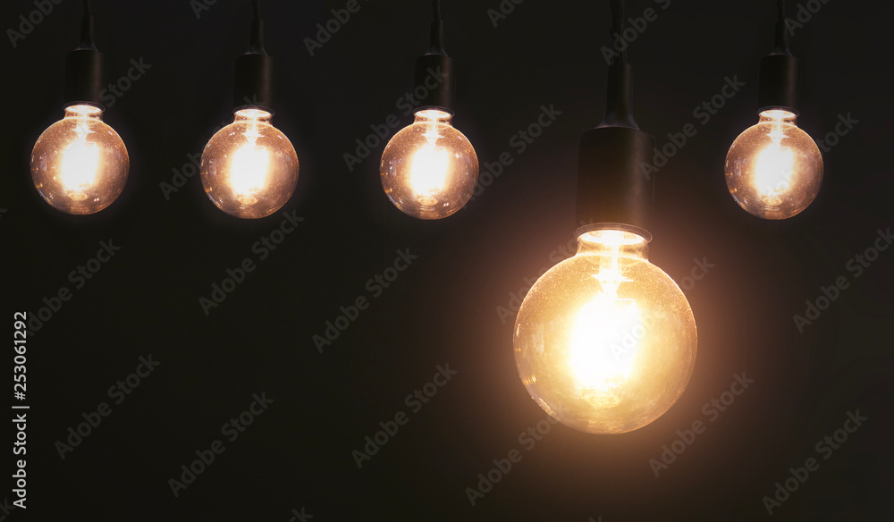 five hanging light bulb on black background. energy concept