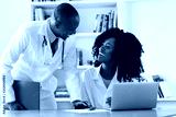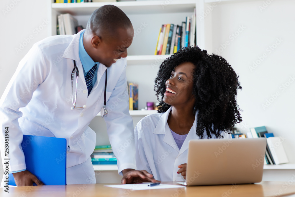 African american chief physician with young female doctor at work