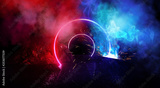 Space futuristic landscape. Fiery meteorites, sparks, smoke, light arches. Dark background with light element in the center. Silhouette of a man, a reflection of neon lights. 3d rendering.
