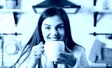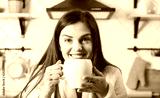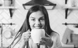 Brunette woman smiling at the kitchen with white cup