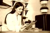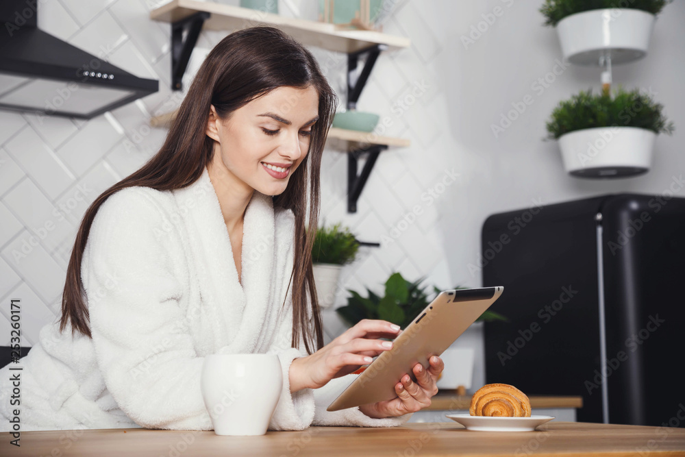 Beautiful girl in a white bathrobe using smartphone during drinking juice