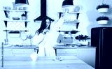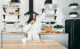 Brunette woman in white bathrobe sing a song to the apple like a microfon at the kitchen
