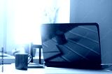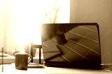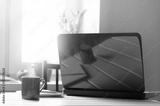 red cup of coffee and a notebook on the table are reflected in the lid of the laptop against the background of the window. day break