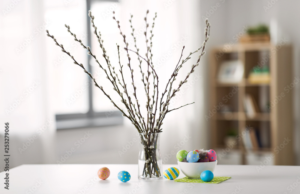 holidays and object concept - pussy willow branches and colored easter eggs in vase on table