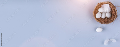 Easter eggs in nest and spring flowers on holiday background. Top view with copy space. Happy Easter card