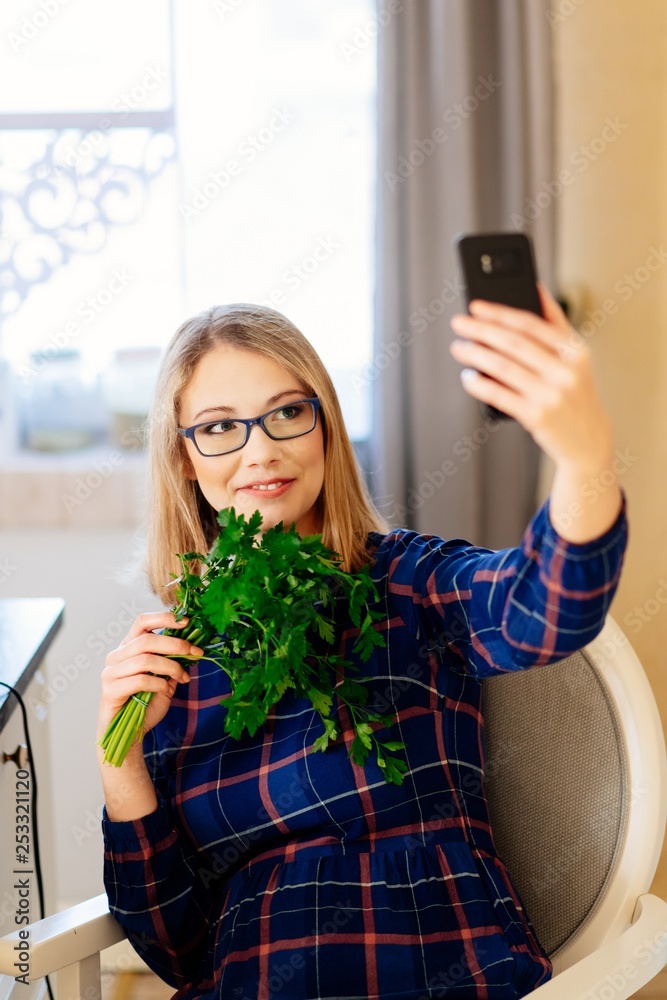 Young woman food blogger taking selfie photo with parsley in kitchen