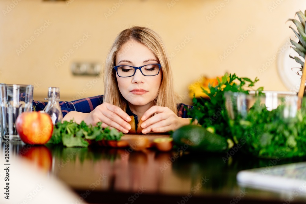 Woman with two kiwi halves in the kitchen.