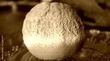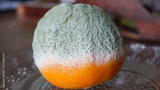 Moldy rotten orange on a plate on wooden background. Inappropriate attitude toward food, modern life, consumerism concept. Wasting food conceptual photo. Waiting for a long time. Covered with mildew.