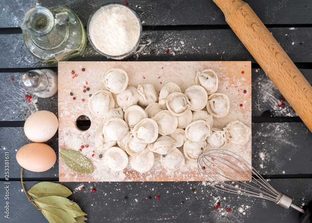 dumplings, raw dumplings, flour, wooden Board, Corolla, bottles, oil, spices, eggs, Bay leaf, rolling pin