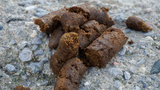 Dog poop or shit on the street pavement. Concept of picking up dog waste shit, cleaning city urban environment, pet excrement. Food for insects. Heap of fresh brown canine excrement. Text copy space.