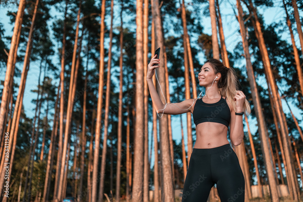 Beautiful girl with long hair takes selfie, online social networking application. In summer in park, fresh air in leggings and tops. Free space. Healthy lifestyle and fitness training outside city.