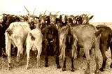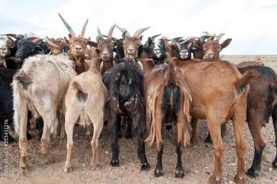 Gegenüberstehende, angebundene Ziegen vor dem Melken in der Steppe der Mongolei