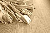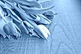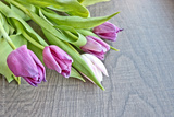 A bouquet of lilac and white tulips with fresh green leaves against a dark wood background. Copy space for text.