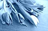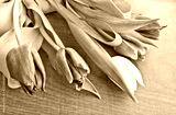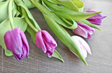 A bouquet of lilac and white tulips with fresh green leaves against a dark wood background. Copy space for text.