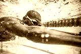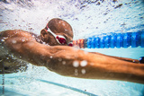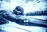 Underwater image of a male swimmer diving and swimming in a swimming pool to train