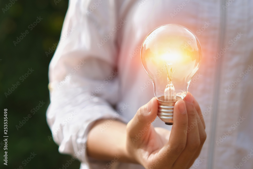 hand woman holding light bulb, innovation and inspiration concept