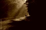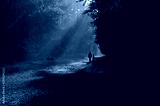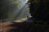 Ein Mann mit Hut geht mit seinem Kind im Wald spazieren