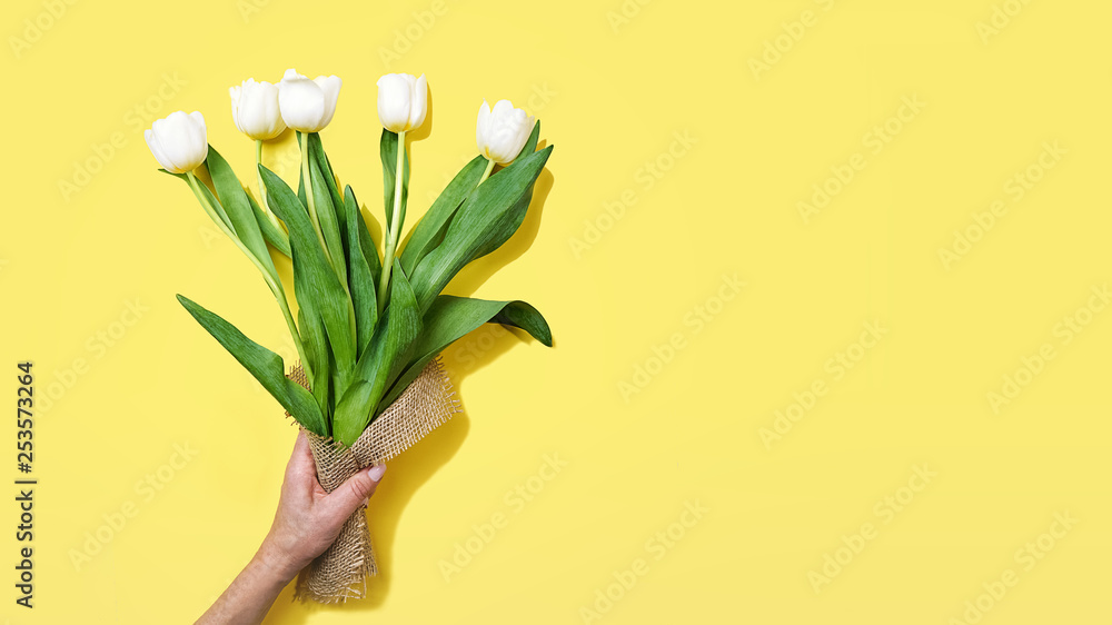 Bouquet of white tulips in a female hand on yellow background. Concept of gift for Valentine's day, birthday, 8 March, mother day. Flat lay, top view, copy space.