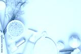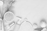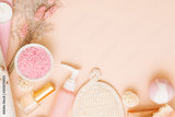 Body care cosmetic spa set. Healthy relaxation lifestyle. Copy space on coral pink background.