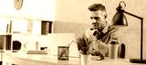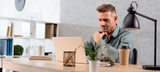 panoramic shot of pensive businessman sitting near laptop in modern office