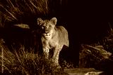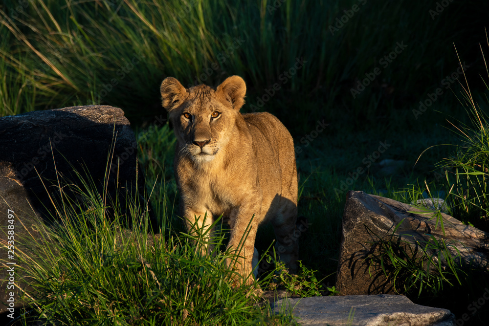 Lion cubs relaxing near a creek and in playful mood with their brothers and sisters inside Masai Mara National Park during a wildlife safari