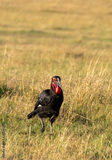 A ground hornbill hunting for food in the plains of Africa inside Masai Mara National Park during a wildlife safari