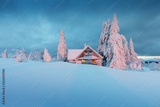 Beautiful snowy winter landscape with cottage cabin village in christmas vacation time near ski resorts. Dramatic overcast sky. Beauty world. Colorful outdoor scene celebration concept