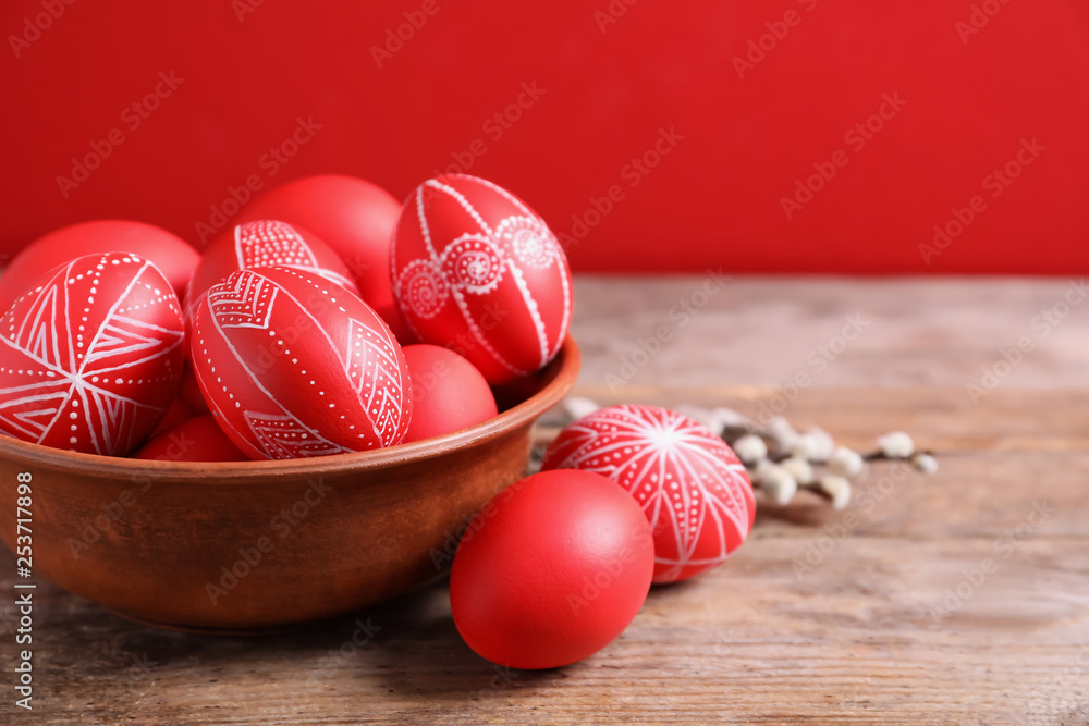 Wooden bowl with red painted Easter eggs on table against color background, space for text
