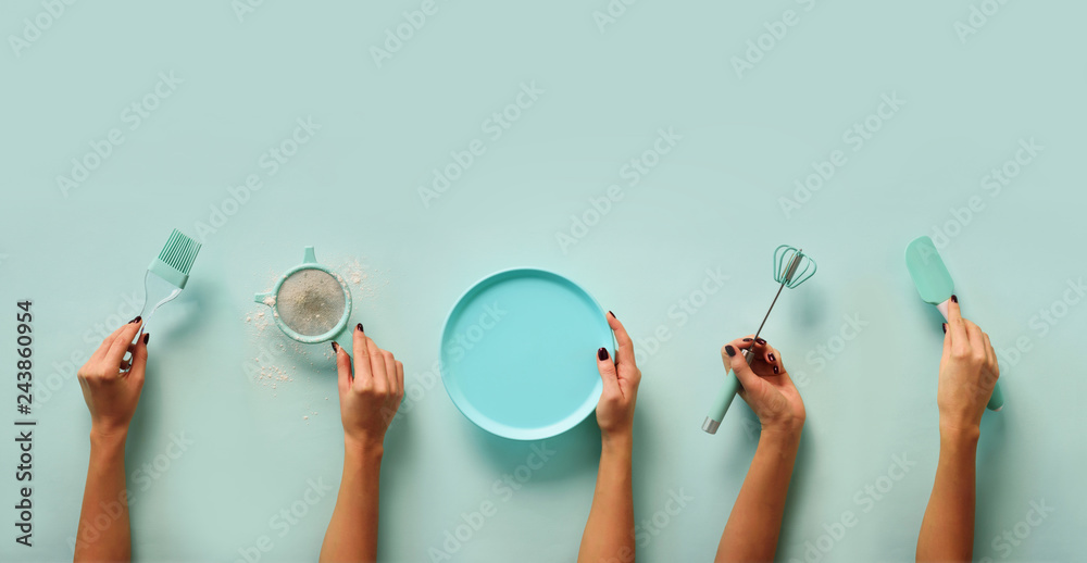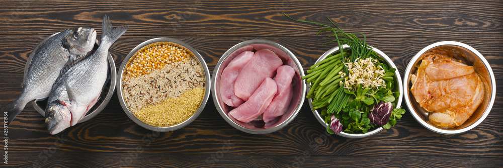 Panorama banner with healthy pet food ingredients with chopped raw turkey, fish, groats, greens and grains in individual bowls on brown wooden background. Flat lay.