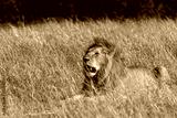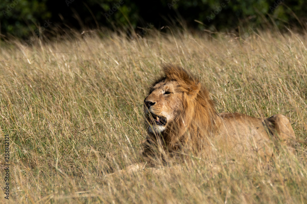 A lone male lion relaxing in the high grasses of Masai Mara National Reserve during a wildlife safari