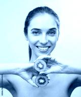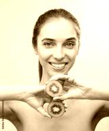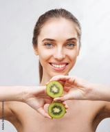 Healthy woman holding a piece of kiwi in her hands and smiling