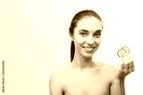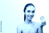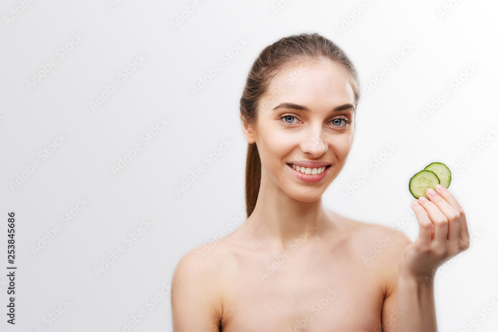 Healthy young woman holding a slice of cucumber while standing on the white background