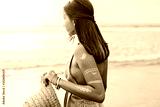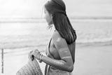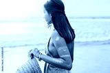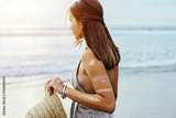 Young girl with silver tattoo and boho jewelry on sunset