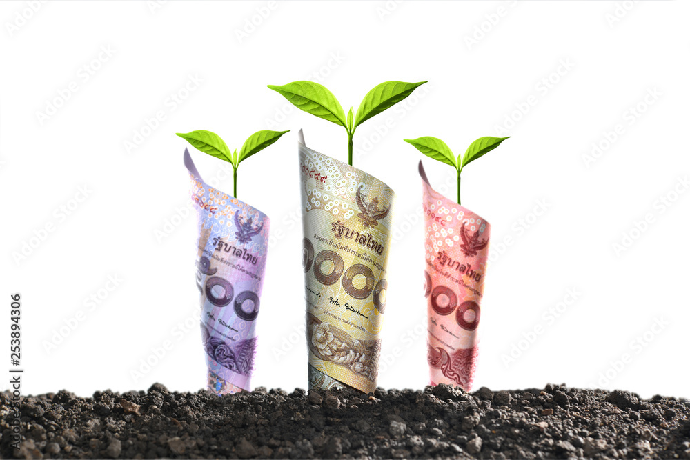 Image of THAI money banknotes with plant growing on top for business, saving, growth, economic concept isolated on white background