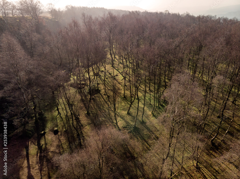 Stunning abstract aerial drone landscape image of early morning shadows through trees in forest in the Peak District in England