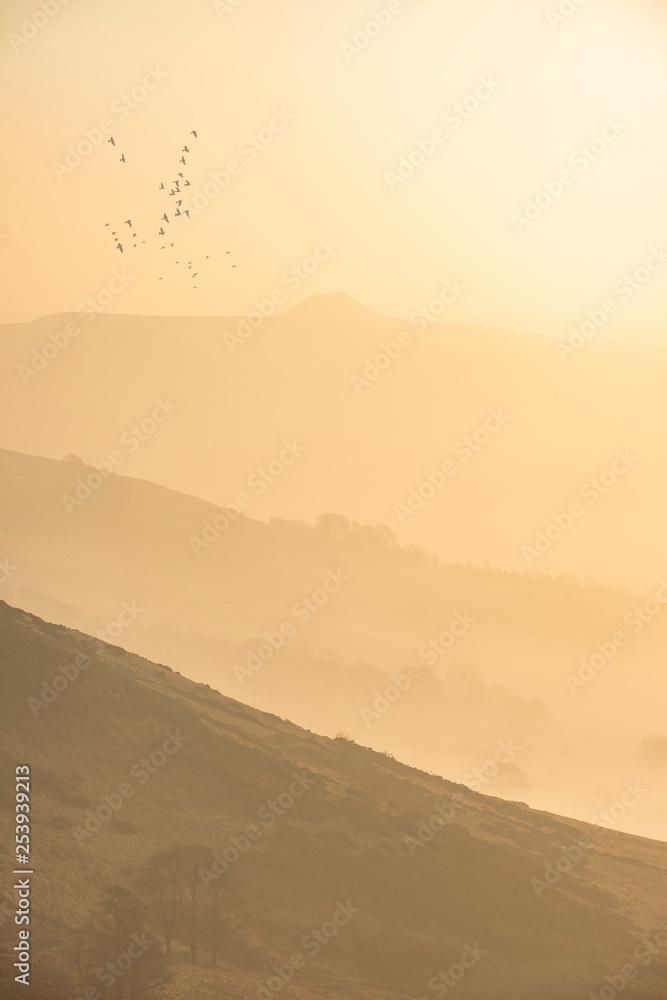 Stunning Winter sunrise landscape image of The Great Ridge in the Peak District in England with a cloud inversion and mist in the Hope Valley with a lovely orange glow