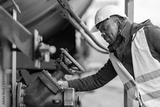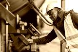 Afro-American train mechanic wearing safety equipment (helmet and jacket) checking and inspecting gear train